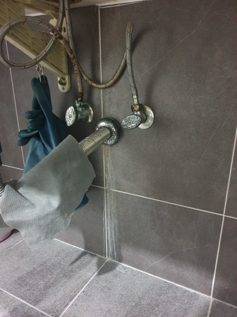 세탁기 쪽에서 공압을 걸려고 합니다. 그런데 냉수쪽 수전이 잘 돌아가지 않네요. 완전히 경화가 되고 고착 되어서 풀기가 쉽지 않습니다. 무리하게 풀다가 배관에 데미지 주는 것을 가장 경계 해야 합니다.