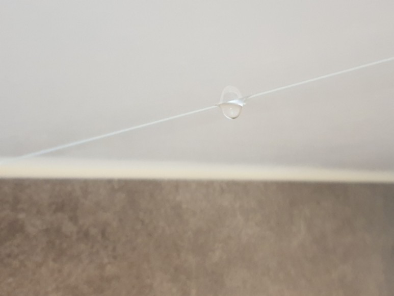 물방울이 고여 있네요. 누수가 되고 있습니다. 이 물이 떨어지는 것은 결과이고 어디서 출발한 물인지 원인을 찾아야 합니다. 바로 위에서 떨어진다고 그 윗부분이 문제다라는 인식은 누수에서 바람직한 견해가 아니에요.